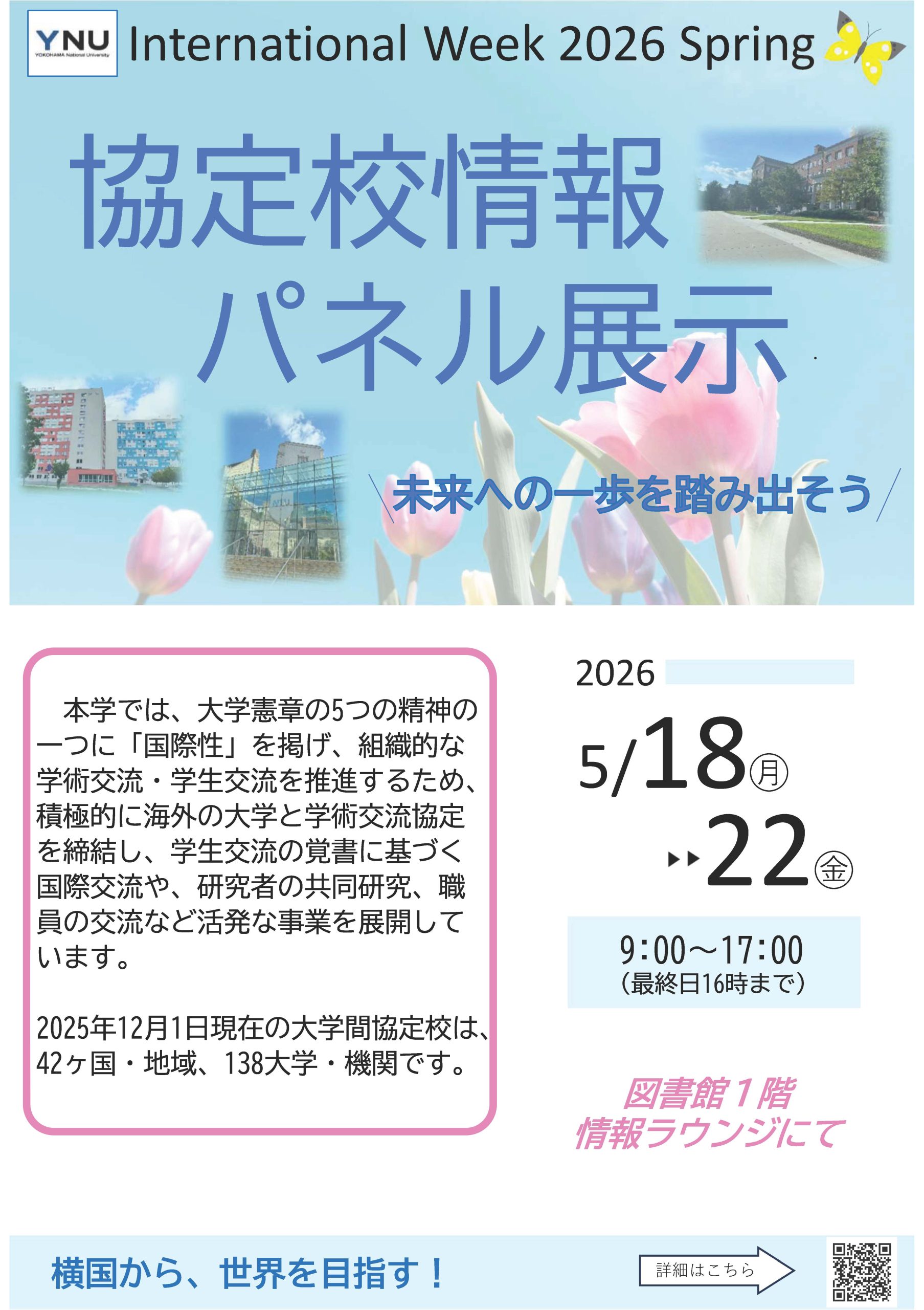 令和8年度春学期は、13の国・地域の23協定校より35名の交換留学生が、横浜国立大学での留学を開始します。