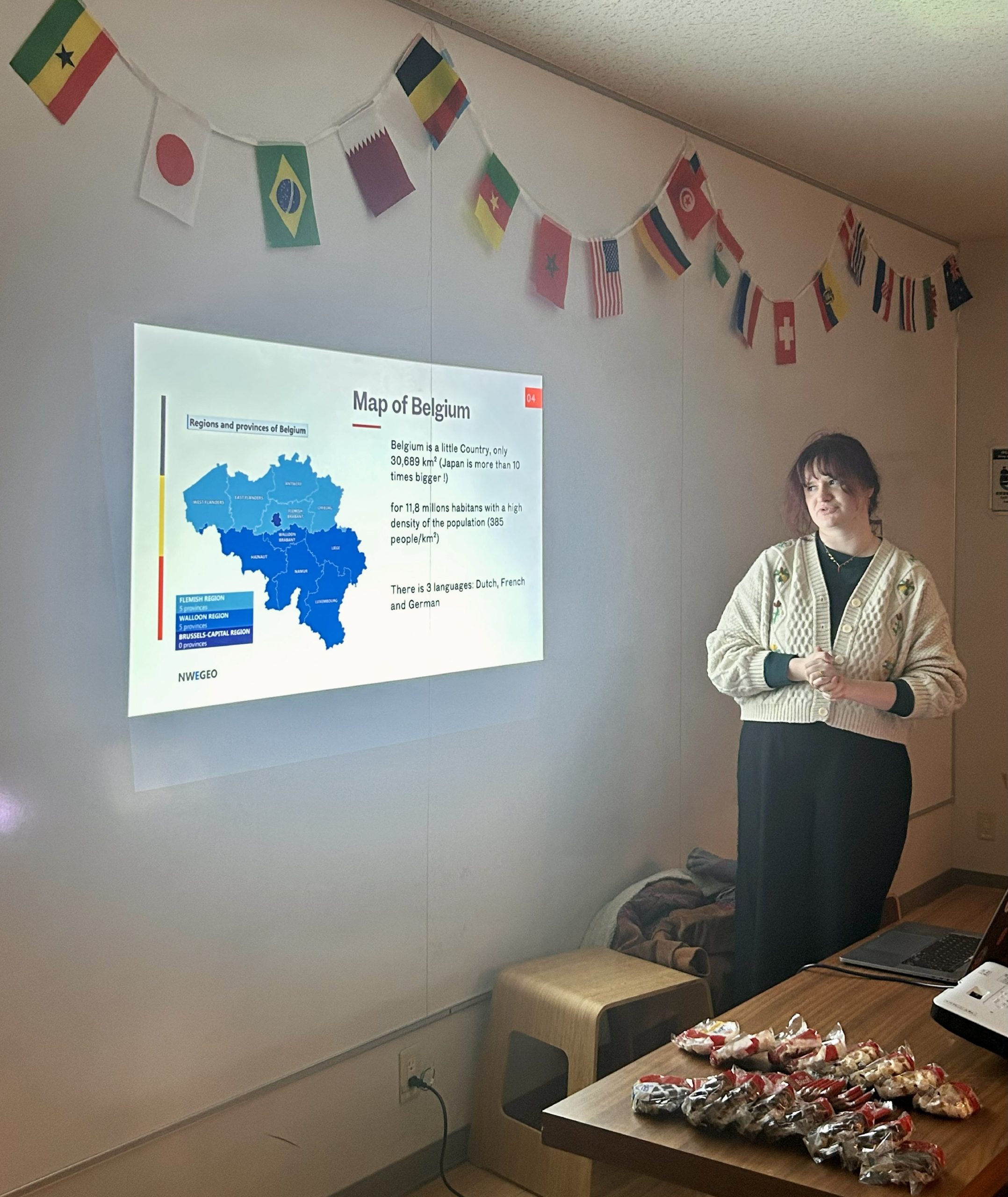 - 第11回目は、ベルギー出身のフローレンスさん(JOYプログラム)が、日本でも人気の高いチョコレートやワッフルで知られるベルギーの魅力を日本との比較を交えながら、地理や歴史、文化・芸術、美食、そして故郷のリエージュの街まで幅広く紹介してくれました。 ベルギーはヨーロッパ北西部に位置し、北部のオランダ語圏、南部のフランス語圏、東部のドイツ語圏と、地域ごとに異なる言語や文化を持つ国です。参加者は発表を聞き、さらに質問を通して留学生の視点に触れることで、多様な文化や価値観が共存するベルギー社会の理解を深めることができました。